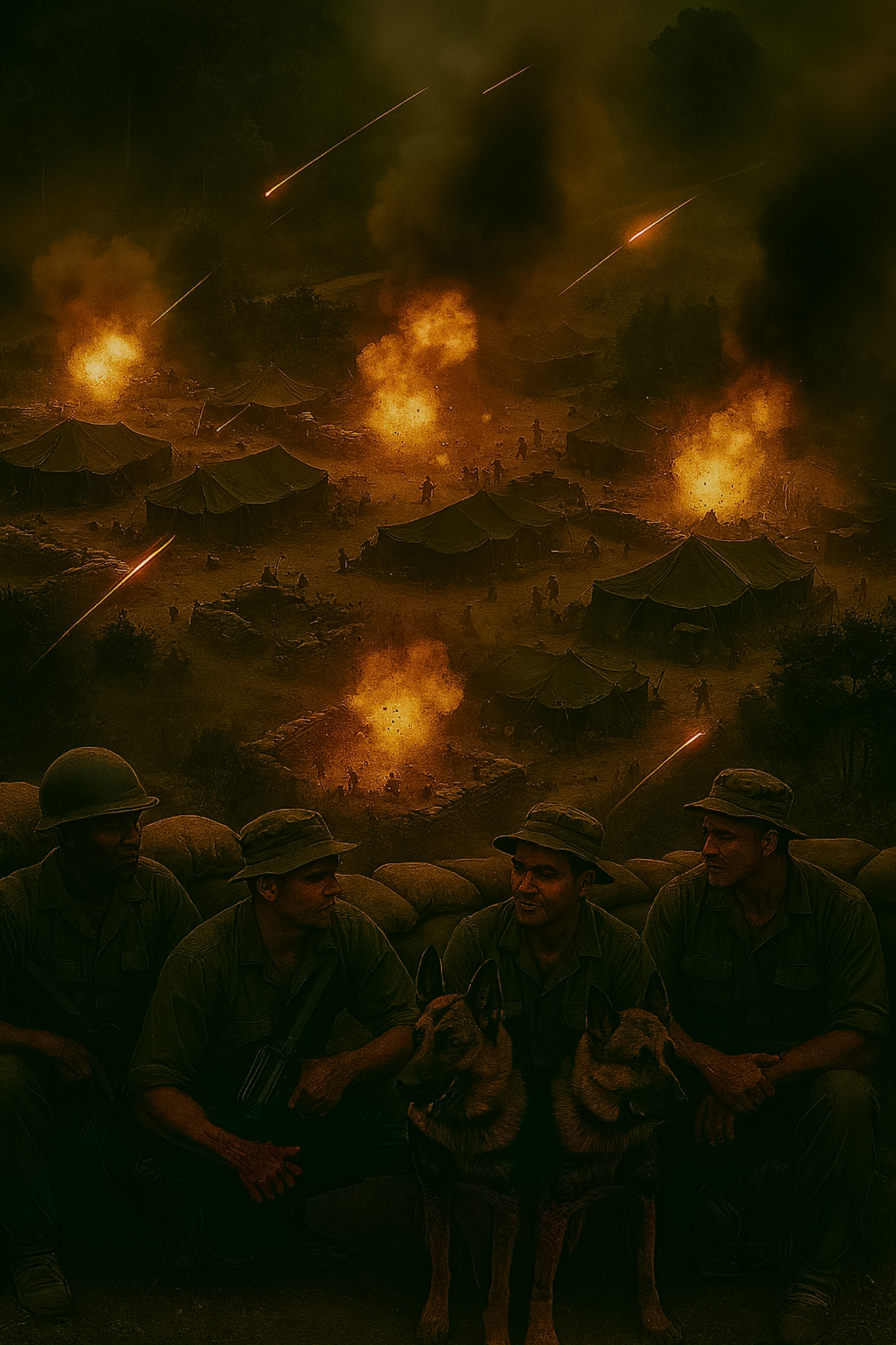 The night pressed down like a hand over the jungle, dense and humid, tasting of smoke. Firebase Bearcat glowed in ragged pulses—bursts of orange where mortars walked along the interior, white flares snapping overhead, tracer rounds stitching thin, molten lines through the dark. The first wave of the attack had found gaps and soft places, tearing canvas and sandbags and nerve. Now the cadence settled into a brutal rhythm: thump-thump, impacts, shouts, return fire, thump-thump again.
